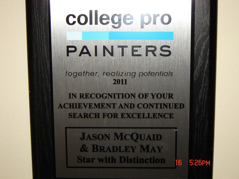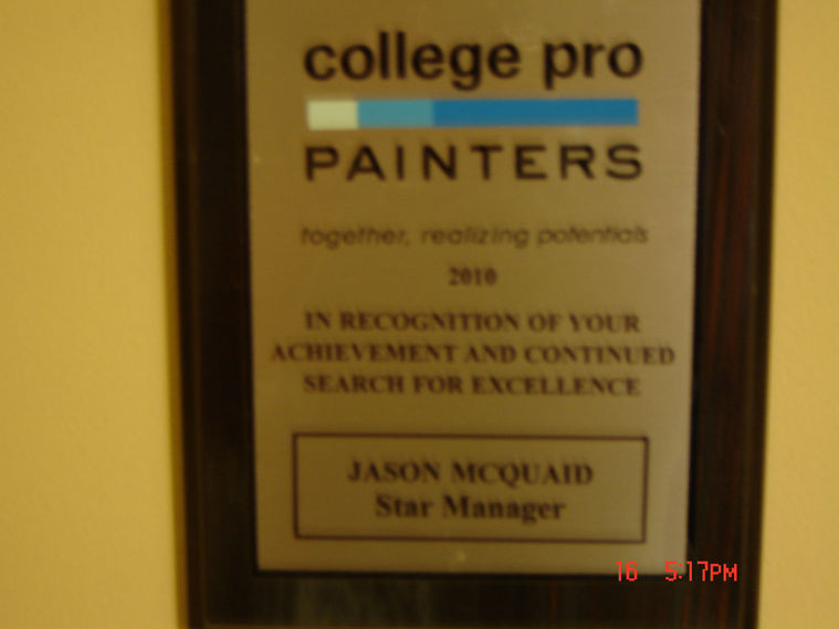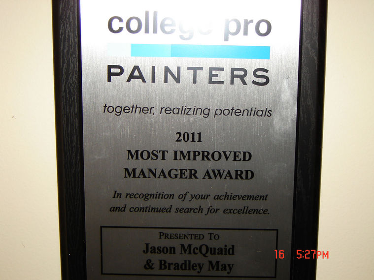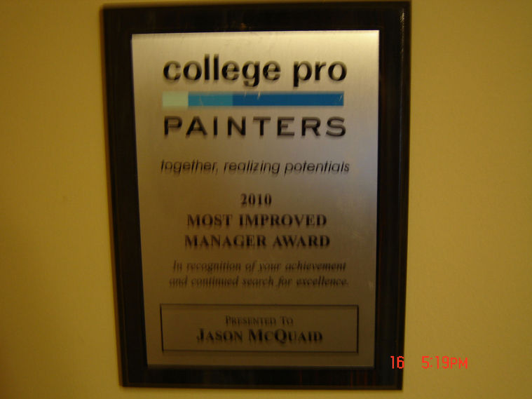Jason demonstrated tremendous improvement over his two years with College Pro. Working in a partnership in this past year(2011), Jason (and Brad) doubled the size of their business, lead the division with one of the top net promoter scores and worked independently. (Rodney Larmand, President of College Pro Painters)