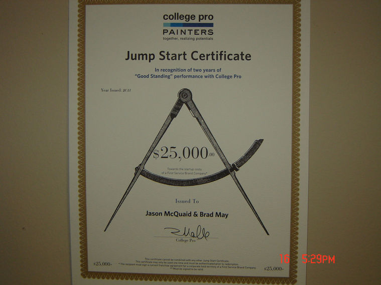 The Jump Start award/certificate is awarded to franchisees who have demonstrated to be in "Good Standing" with College Pro.